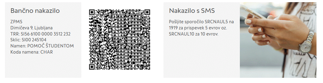 Bančno nakazilo: TRR: SI56 6100 0000 3512 232 (Zveza prijateljev mladine Slovenije, Dimičeva 9, Ljubljana). sklic: SI00 245104, namen: POMOČ ŠTUDENTOM, koda namena: CHAR