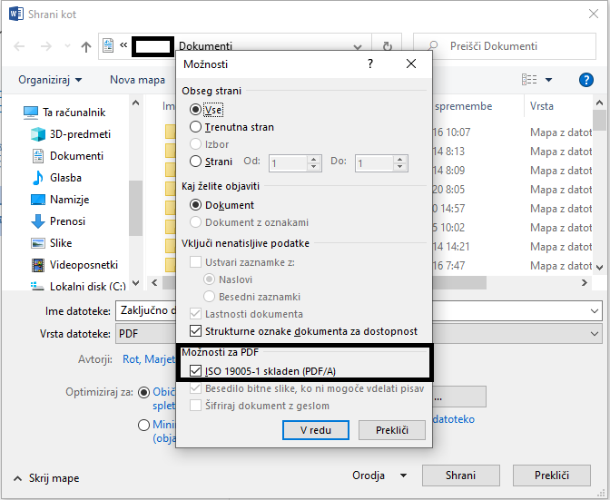 Navodila: Ko zaključno delo shranjujete v PDF obliko, se vam ob kliku na kvadrat MOŽNOSTI odpre spodaj prikazano okno. Poskrbite, da je obkljukana možnost: ISO 19005-1 skladen (PDF/A).